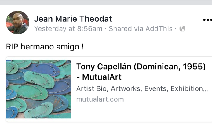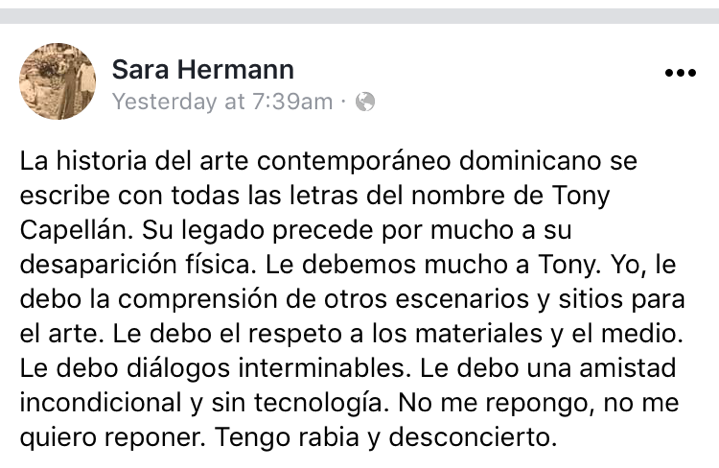 La repentina muerte del artista Tony Capellán (1955-2017) ha provocado un caudal de reacciones a través de las redes sociales. Su partida a destiempo tiene un gran significado para muchos artistas dominicanos.