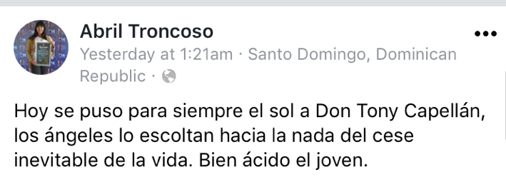 En un mensaje de correo electrónico el escritor e investigador Miguel D.Mena reacciona ante el deceso de su amigo con estas palabras: «A Tony tendremos que despedirlos como él mismo se moviera en la vida: de lejito aunque bien sentido, pasando por allí y uno con la alegría de poder sentarse con él y hablar tantas cosas chulas y disfrutar esas historias suyas, su aventuras interminables».