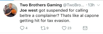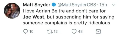 During an interview with Bob Nightengale of USA Today, published June 20, West was asked who was the biggest complainer in baseball and he responded by naming Beltré. West stated, “It’s got to be Adrian Beltré. Every pitch you call that’s a strike, he says, ‘Whoa! Whoa! Whoa!’ I told him, ‘You may be a great ballplayer, but you’re the worst umpire in the league. You stink.’’ In the interview, West notes Albert Pujols as “probably the best right-handed hitter” he ever saw, and also clarified to Nightengale that he and Beltré are on “friendly terms.”
