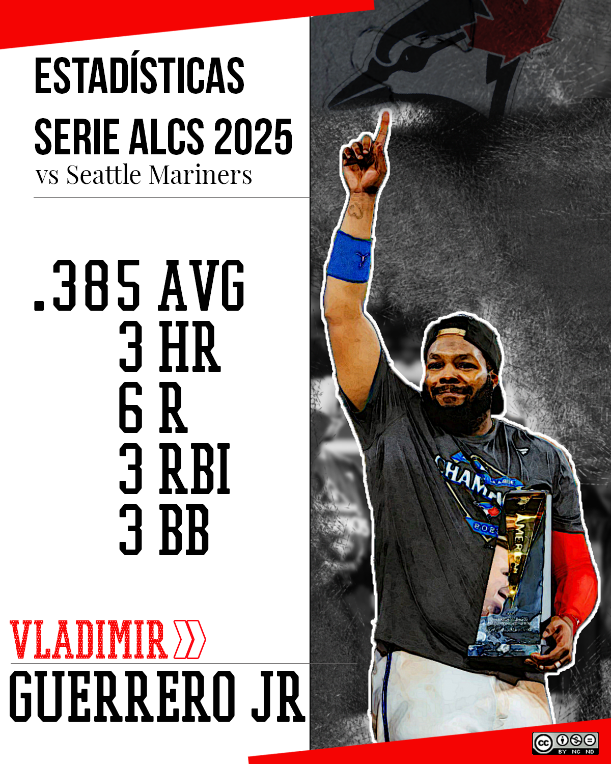 TORONTO — El béisbol tiene momentos que trascienden las estadísticas, y Vladimir Guerrero Jr. acaba de escribir uno con tinta indeleble en la historia de octubre. El hijo del Hall of Famer Vladimir Guerrero fue coronado MVP de la ALCS 2025 después de demoler a Seattle con una actuación para enmarcar: .385 de average (10-26), 3 jonrones monumentales, 3 dobles que retumbaron en las paredes, 4 bases por bolas y apenas 2 ponches. Números de videojuego. Números de leyenda.