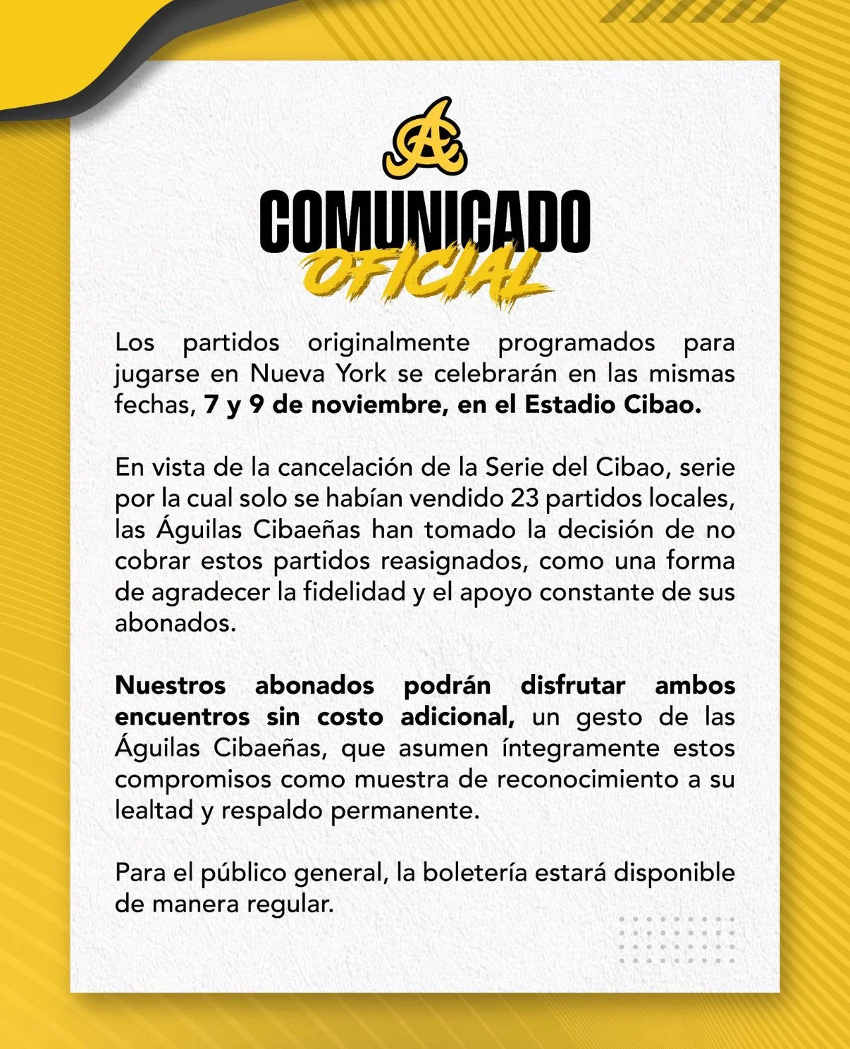 SANTIAGO.— Las Águilas Cibaeñas tomaron una decisión que habla de gratitud e identidad: los dos juegos de la «Copa del Cibao» programados para New York este viernes 7 y domingo 9 de noviembre se jugarán en el Estadio Cibao. La directiva fue clara: «Gracias por su respaldo, el equipo juega en casa para ustedes».