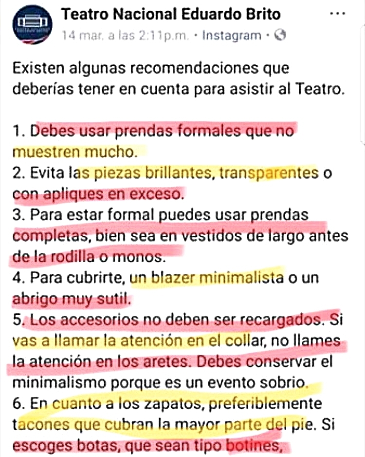 El anuncio coincide con una nota del antiguo Teatro Nacional Eduardo Brito donde se enfatizaba el tipo de vestimenta requerida para asistir a las funciones de las salas teatrales de la institución. (En el 2007, la prensa se hizo eco del tipo de vestimenta el Teatro aprobaba). La regla del ahora Teatro Medieval se enfoca en la restricción del cuerpo de la mujer. Sólo pueden asistir aquellas personas que se vistan como monjas de convento.