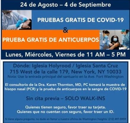 NEW YORK, NY – El congresista Adriano Espaillat (NY-13), la doctora Karen Thornton, el concejal Ydanis Rodríguez, la asambleísta Carmen de la Rosa, and y el asambleísta Al Taylor en colaboración con profesionales médicos y líderes religiosos, llevará a cabo una conferencia de prensa el miércoles, 26 de agosto, a las 11:00am, para abordar el impacto del COVID-19 en los vecindarios de Washington Heights e Inwood en el distrito. La conferencia de prensa se realizará en la nueva clínica de pruebas lanzada esta semana en la Iglesia Holyrood / Iglesia Santa Cruz, ubicada en el 715 West de la calle 179, en Washington Heights.