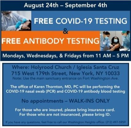 Residents may receive COVID-19 antibody testing (blood test) and COVID-19 nasal swab (PCR) testing at the new testing facility. Medical services will be provided by the office of Dr. Karen Thornton, MD PC. Individuals should bring their health insurance cards as well as identification for those who may be uninsured.