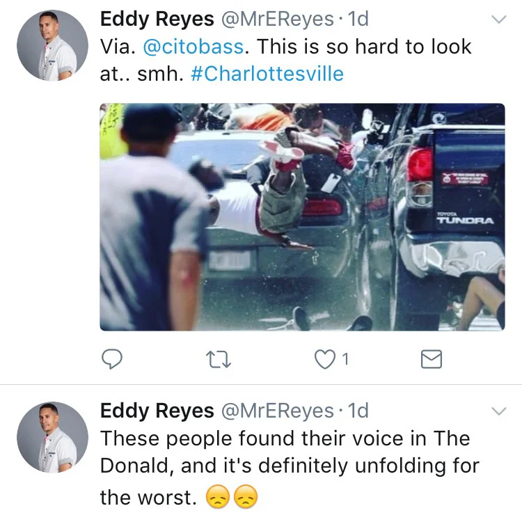 Varias personas han comentado por vía de las redes sociales. La actriz dominicana Laura Gómez dijo, «el chofer de ese carro imitó los actos terroristas utilizado por ISIS. Eso fue un acto de terrorista». El percusionista dominicano Eddy Reyes escribió en Twitter, «Esto es díficil de ver. Estas personas encontraron su voz a través de el Donald», refiriéndose al presidente Donald Trump.