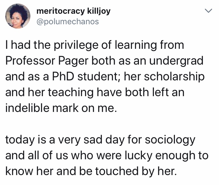 Pager’s work was that of a courageous scholar-activist who brought attention to the injustices of the prison industrial complex and engaged in intellectual work that did not stay within the confines of academia as it pushed for policy changes. Devah Pager was a light in the heart of darkness whose relentless fight for democracy and civil rights for African-Americans will impact future generations.