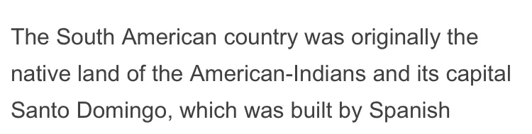 XINHUA: The South American country was originally the native land of the American-Indians and its capital Santo Domingo, which was built by Spanish colonists in 1496, was the first permanent European settlement in the Americas.