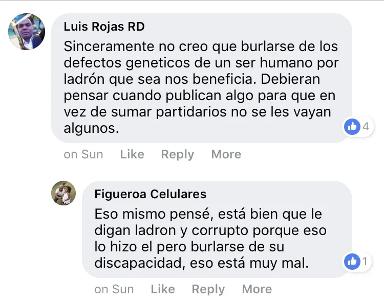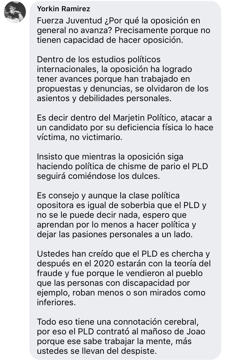Fuerza Juventud no hace política cuando discrimina a Baret y se burla de él. Política es construir ciudadanía, educando a la gente acerca de sus derechos fundamentales no actuando de forma discriminatoria y superior desde las redes sociales. Desde Fuerza Juventud se han hecho denuncias importantes acerca de la corrupción y el clientelismo pero el ataque a Baret es un golpe muy bajo y también un vulgar ataque no sólo a su condición humana, pero a la condición humana de millones de personas que sufren discapacidades o deformaciones físicas.
