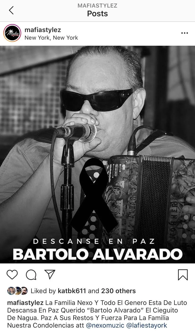 Este pasado viernes, 27 de marzo falleció Bartolo Alvarado, mejor conocido como El Ciego de Nagua en el ambiente musical. El icono del merengue típico falleció en un hospital en Brooklyn, Nueva York tras padecer de deficiencia respiratoria. Alvarado residía en el condado de Brooklyn y recibía diálisis tres veces a la semana. Según una fuente cercana, le hicieron la prueba del coronavirus (COVID-19), sin embargo los médicos aun no tienen los resultados.