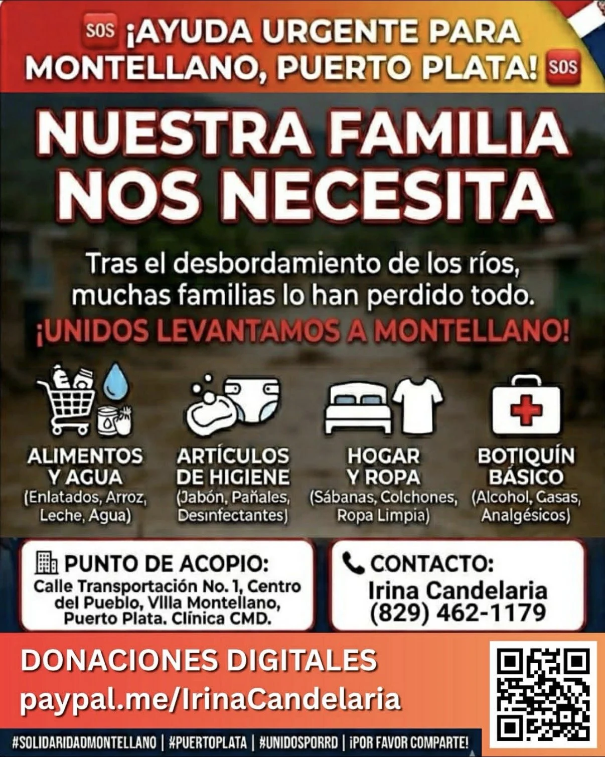 Bajo el lema «Nuestra familia nos necesita», la jornada solidaria recolecta alimentos, agua, artículos de higiene, ropa, colchones y botiquines básicos. El punto de acopio está en la Clínica CMD, Calle Transportación No. 1, Centro del Pueblo, Villa Montellano. También se habilitó una vía de donación digital a través de paypal.me/IrinaCandelaria (ver imagen adjunta para detalles completos).