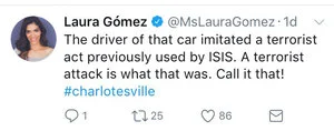 Several people commented via social media. Via Twitter, Dominican actress Laura Gomez wrote, "The driver of that car imitated a terrorist act previously used by ISIS. A terrorist attack is what that was. Call it that!" Dominican percussionist Eddy Reyes retweeted, "This is so hard to look at...smh" and tweeted, "These people found their voice in The Donald, and it's definitely unfolding for the worst."