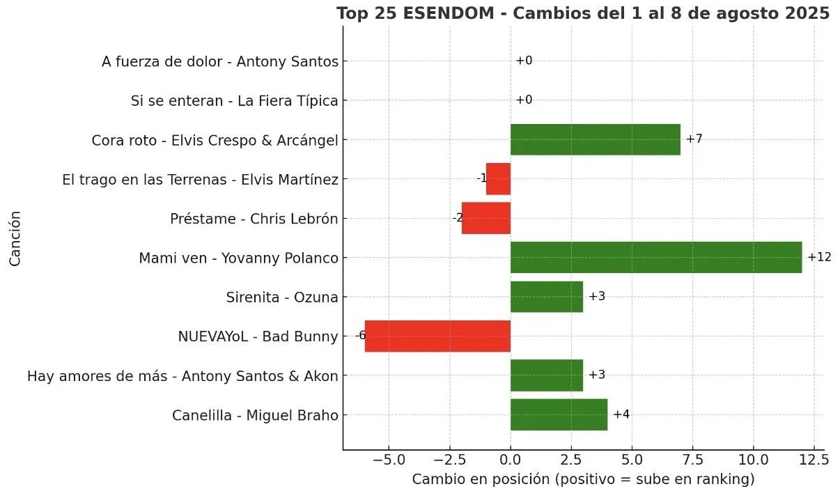 La gran sorpresa del podio viene en el #3, donde «Cora roto» de Elvis Crespo con Arcángel sube desde el décimo lugar, demostrando que el merengue con sabor urbano tiene todavía mucho por decir. En contraste, «El trago en las Terrenas» de Elvis Martínez baja del #3 al #4, mientras que Chris Lebrón y su «Préstame» caen del #4 al #6.